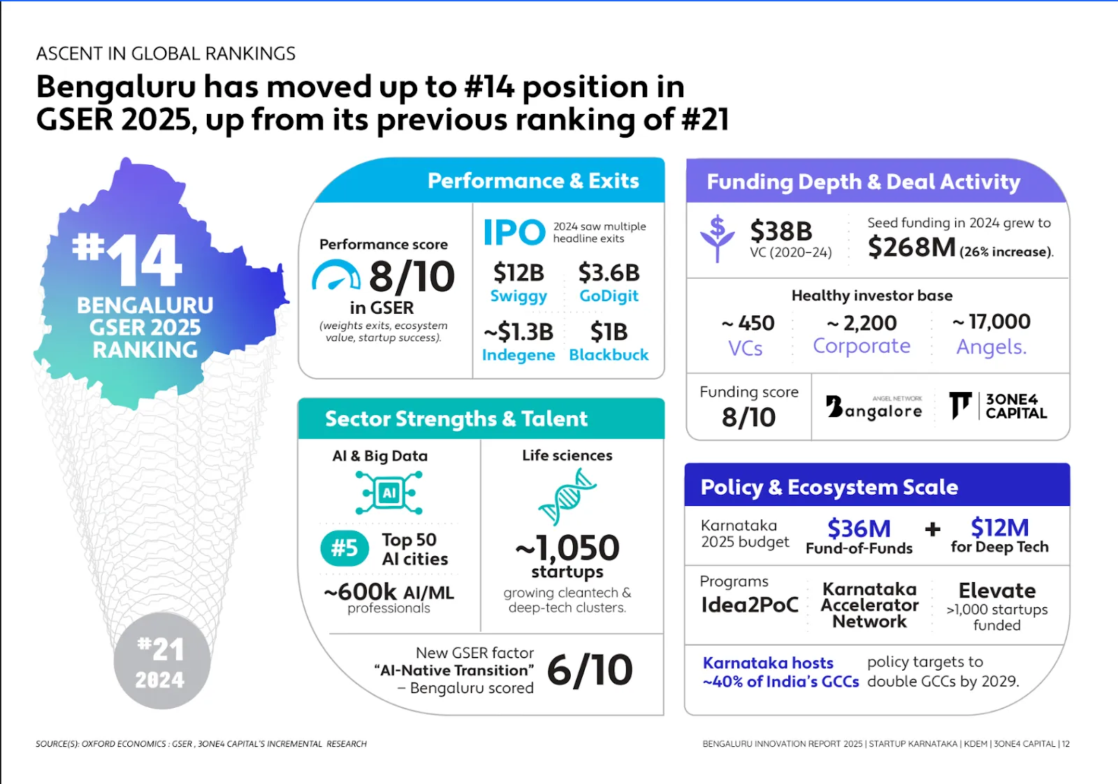 The first definitive signal highlighted in the report is Bengaluru’s ascent in the global hierarchy of startup ecosystems. The city has moved firmly into the top tier of global innovation hubs, ranking #14 in the Global Startup Ecosystem Report (GSER) 2025. This is not a transient metric but a reflection of sustained resilience and scalability.