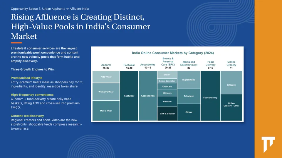 At the top of the pyramid, consumers are shifting decisively toward premium and performance-driven products. The rise of the affluent household, shaped by dual-income families, greater formal employment, and upward mobility in metros and emerging urban clusters, is accelerating demand for high-quality beauty, electronics, apparel, home upgrades, travel, and financial services.